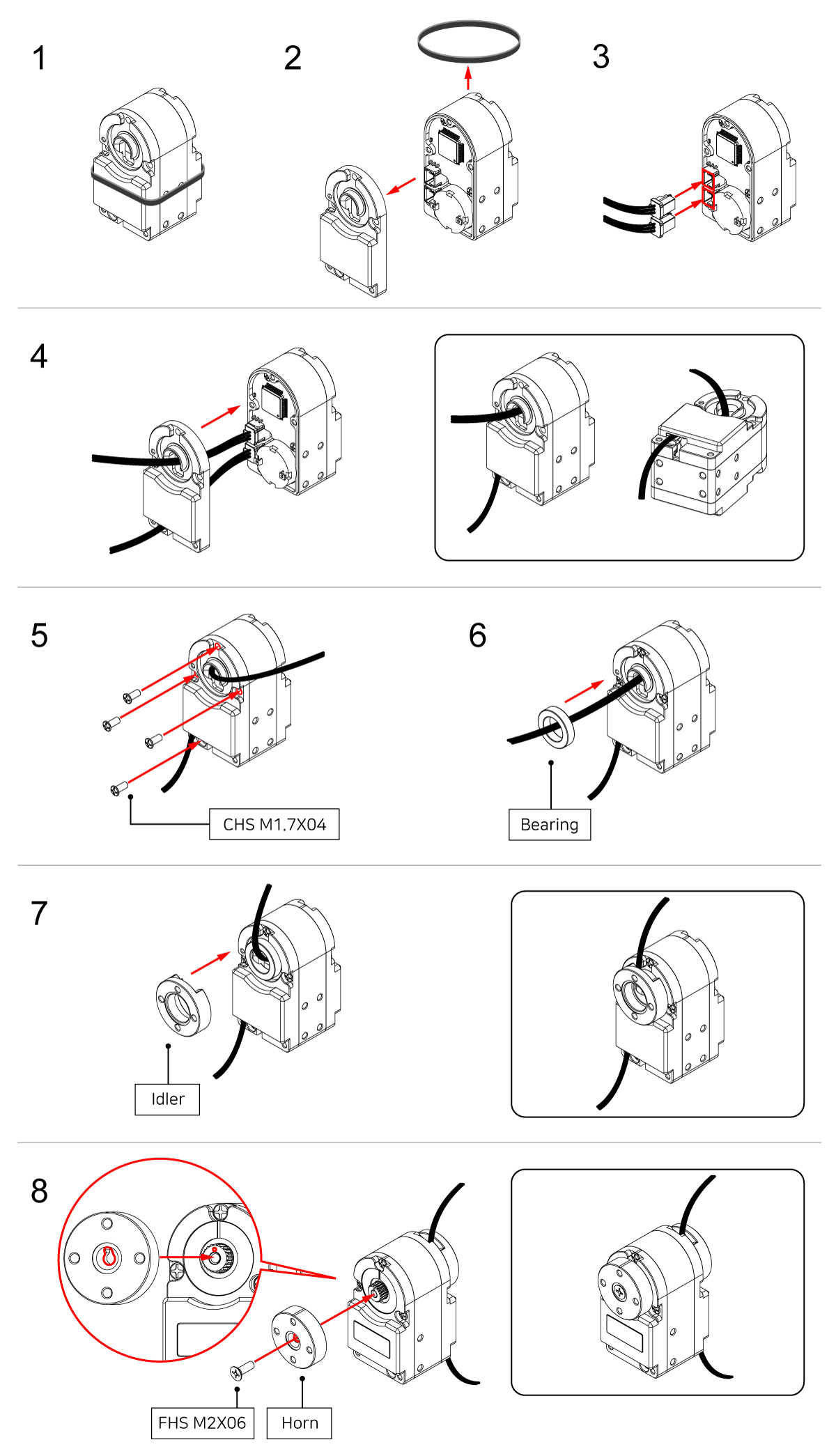 Do not connect or disconnect DYNAMIXEL actuator cables while power is being supplied.