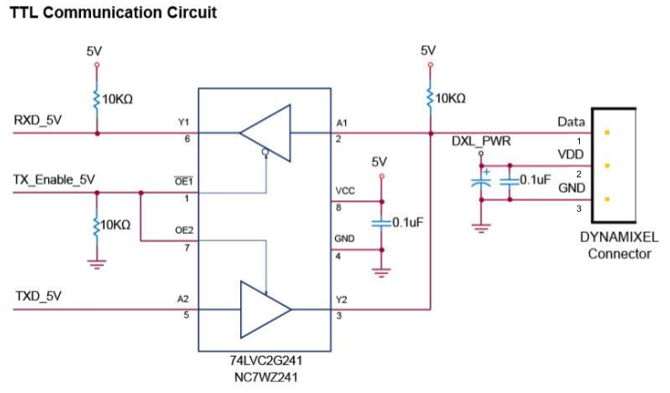 To control the DYNAMIXEL actuators, the main controller needs to convert its UART signals to the half duplex type. The recommended circuit diagram for this is shown below.